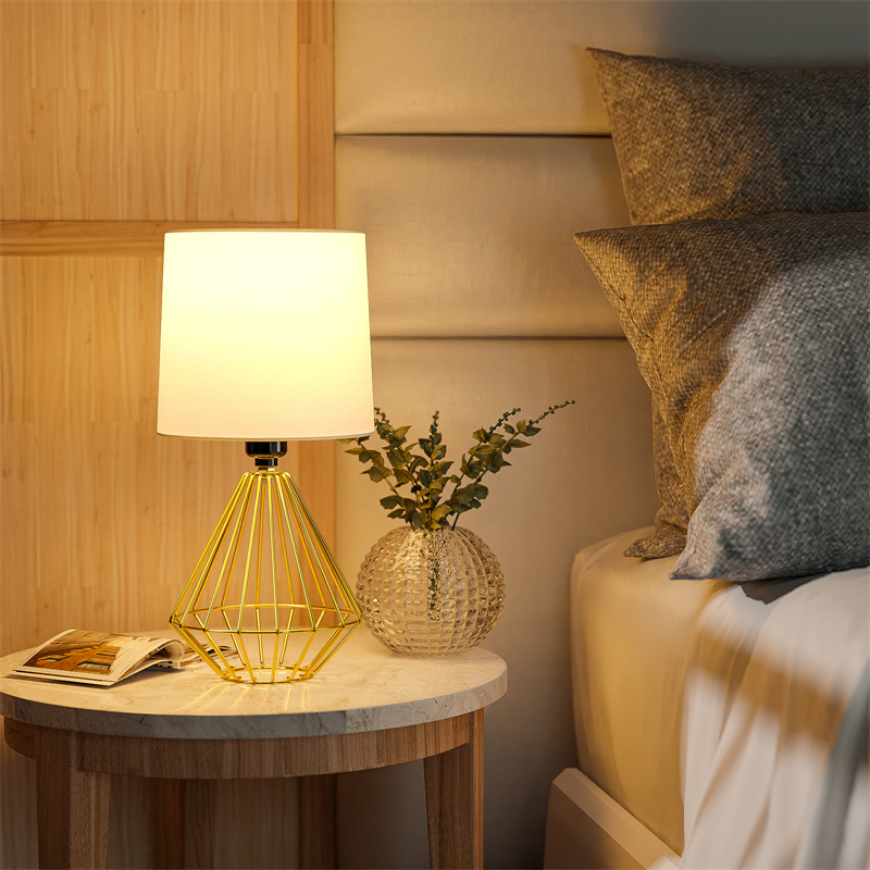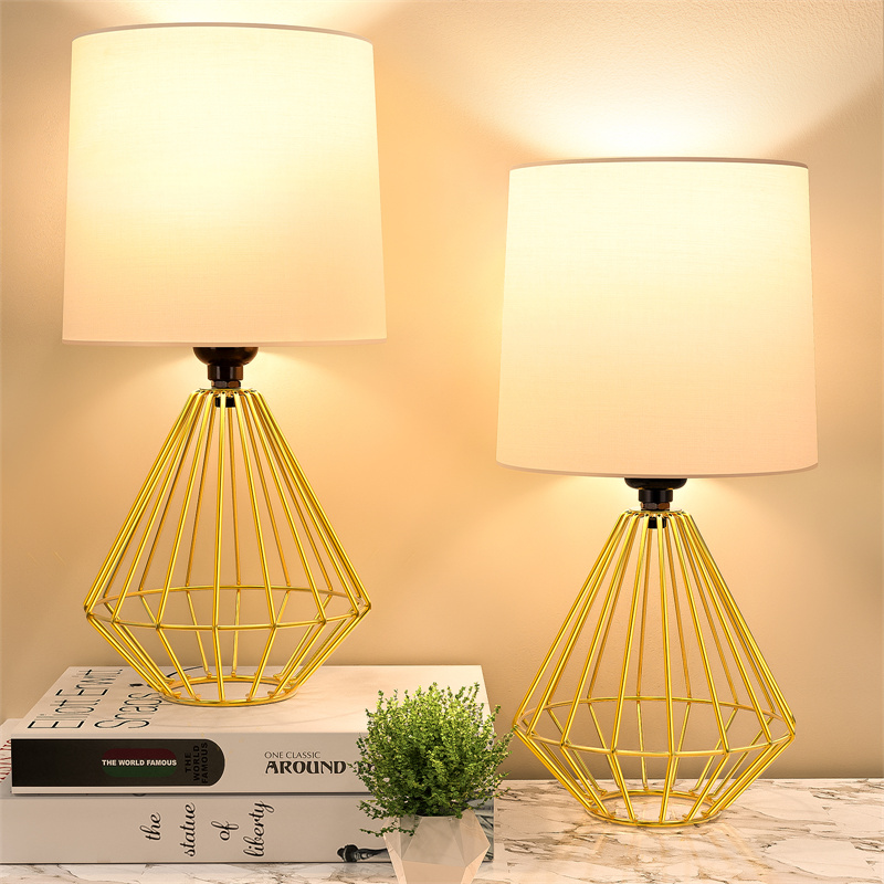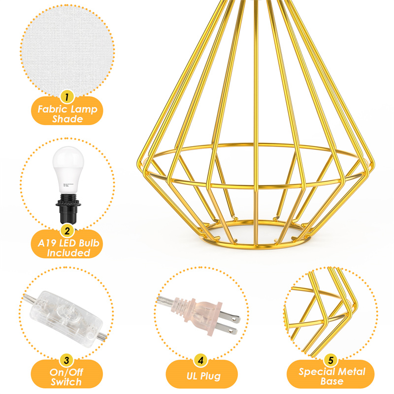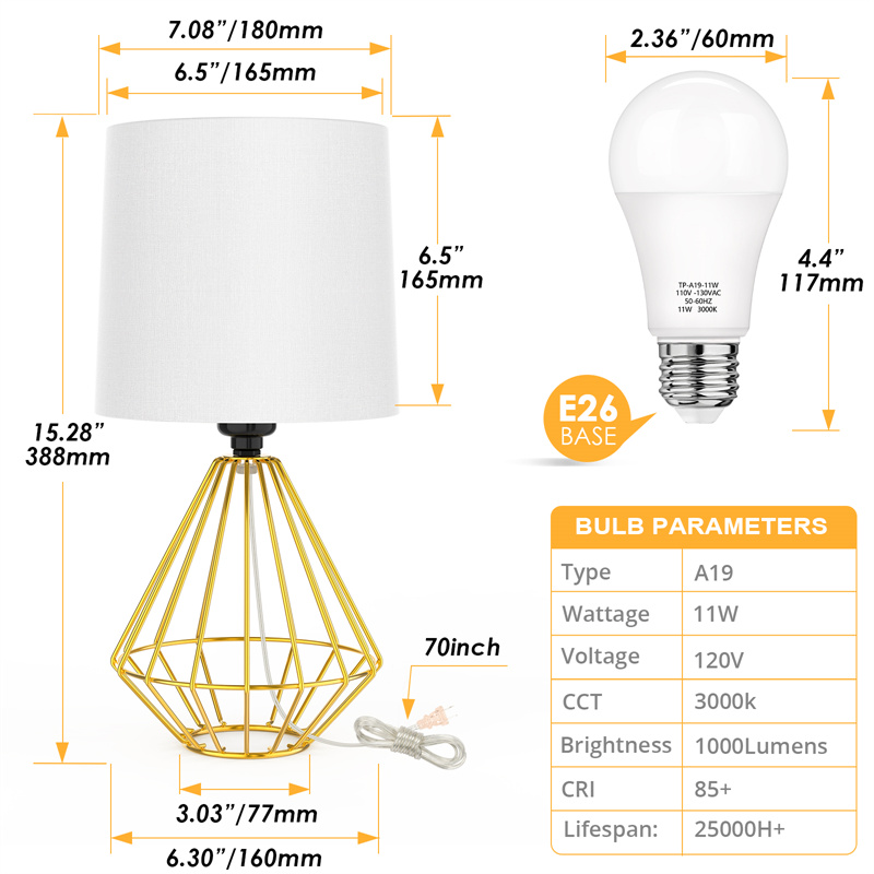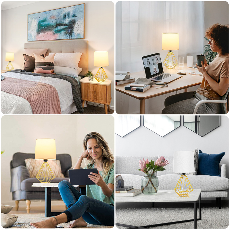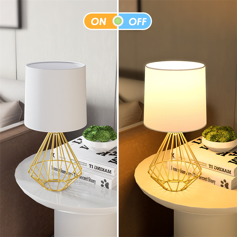 White Fabric LampshadeThe white fabric lampshade can soft the lighting and also will not affect the brightness | Stylish Metal BaseSpecial designed metal geometric base, unique and beautiful. Rust-free | Convenient SwitchJust pressing the button on the cord can turn on/off the button easily. Very convenient for all ages. |
